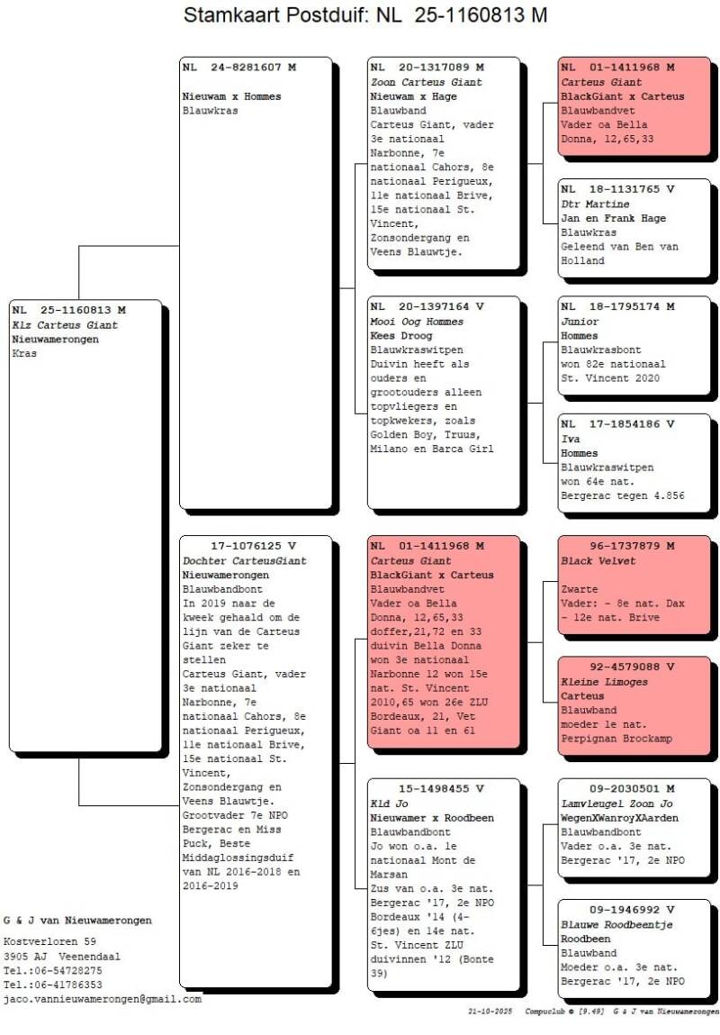 21-09-2025 samen met Hendrie Selder op bezoek geweest bij Mart Stokman. Van Mart heb ik een mooi donker kras doffertje gekregen uit de Wladimir Kiltchko lijn de afstamming zou hij mij nog opsturen. Helaas mocht het niet zo zijn want op 24-09-2025 ontving ik het bericht dat Mart van ons heen gegaan is. Dit doffertje krijgt de naam De Mart. De Mart heeft een gouden ring om van 2024 maar is in 2025 geboren. NL24-2405987