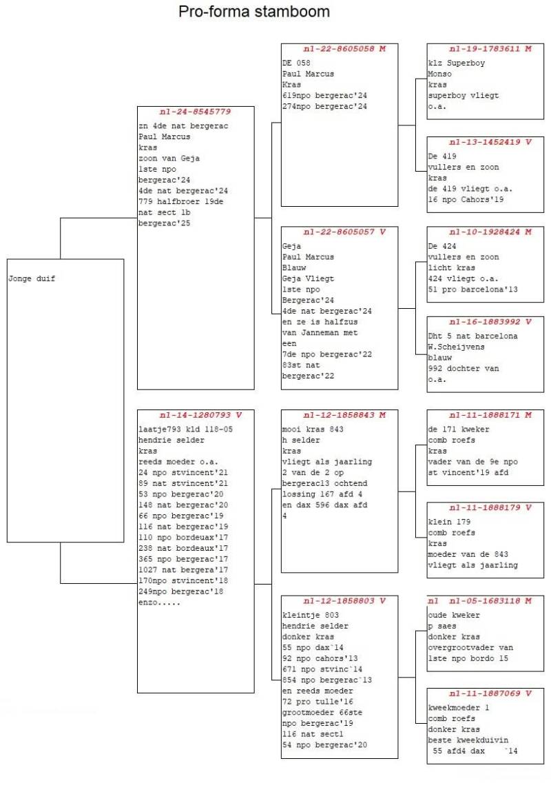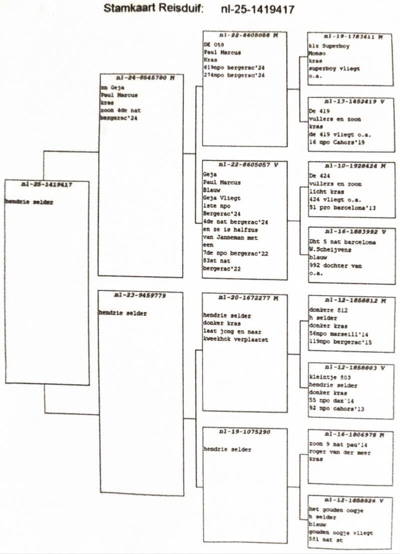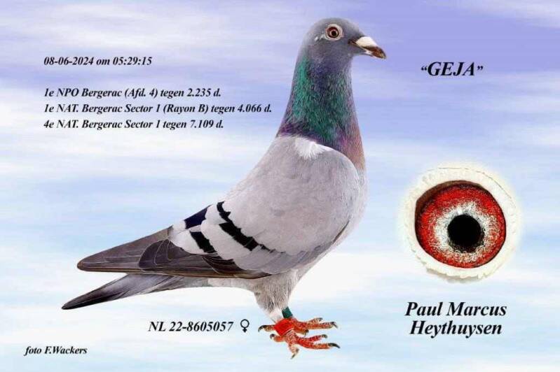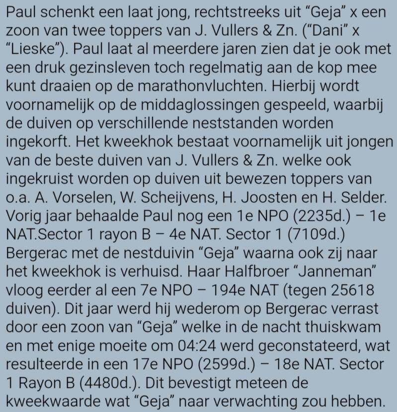 De start van marathonseizoen 2024 was voor Paul direct een schot in de roos. DE duivin GEJA was er vroeg bij en scoorde op deze Bergerac de 4e nat. Sect 1 en 1e afdeling Limburg. Haar halfbroer Janneman vloog eerder in 2022 al de 7e NPO en 83e Nationaal Bergerac. In de afstamming van Gea komen namen voor van John Vullers en zn, superboy van P.Stammen en zn en Speedy Bang van Wiel Schijvens. Het hokbestand bestaat in grote lijnen (kwekers alsook vliegers) uit duiven rechtstreeks van de goede duivenvrienden J. Vullers en Zn uit Roggel. Deze worden op het kweekhok ook ingekruist op enkele duiven verkregen via o.a. A. Vorselen, W. Scheijvens en H. Selder.