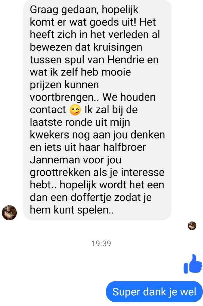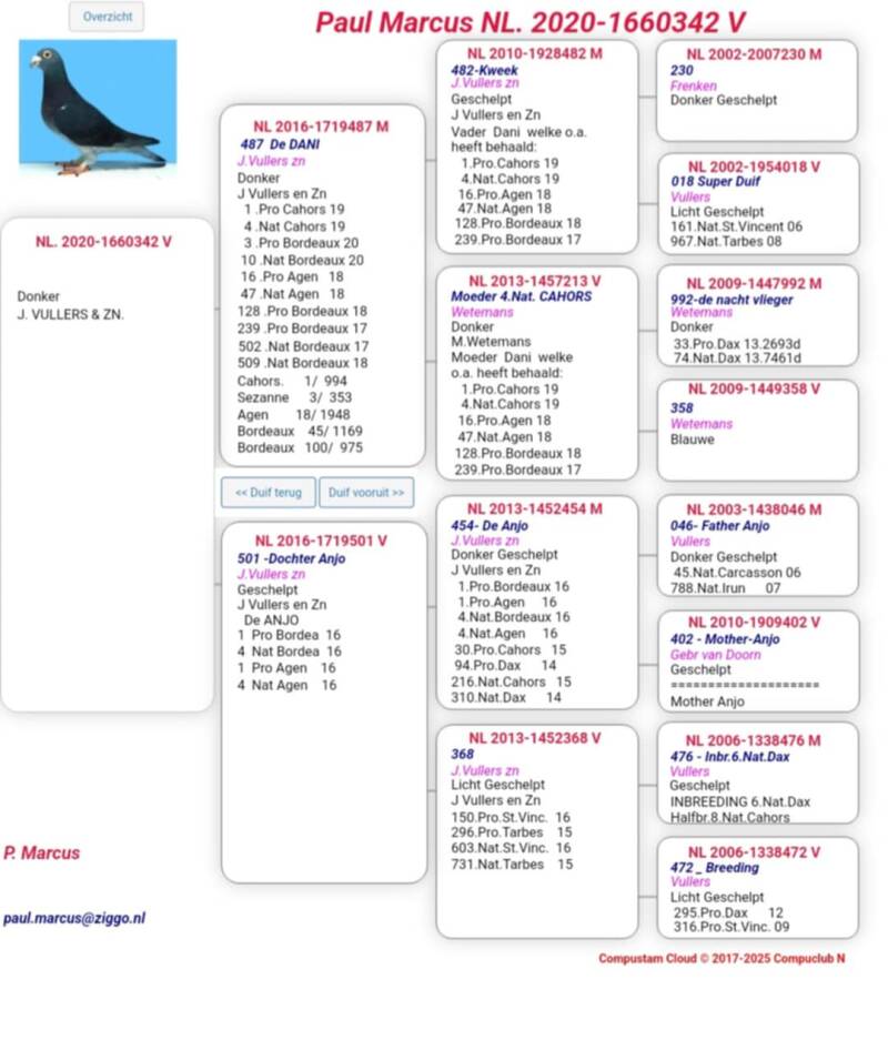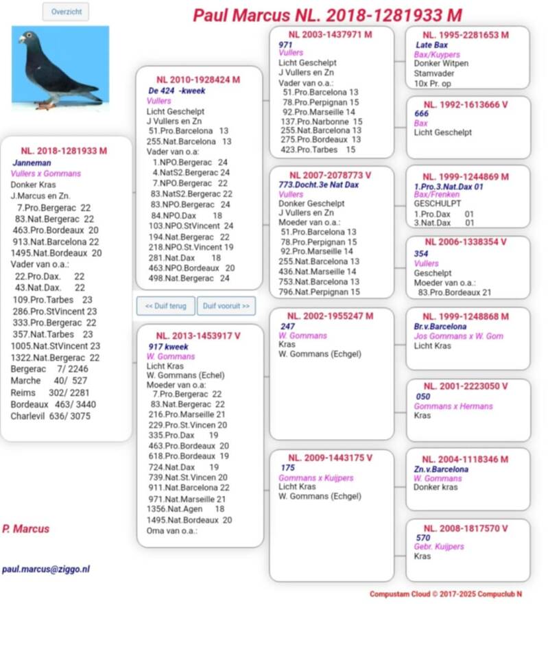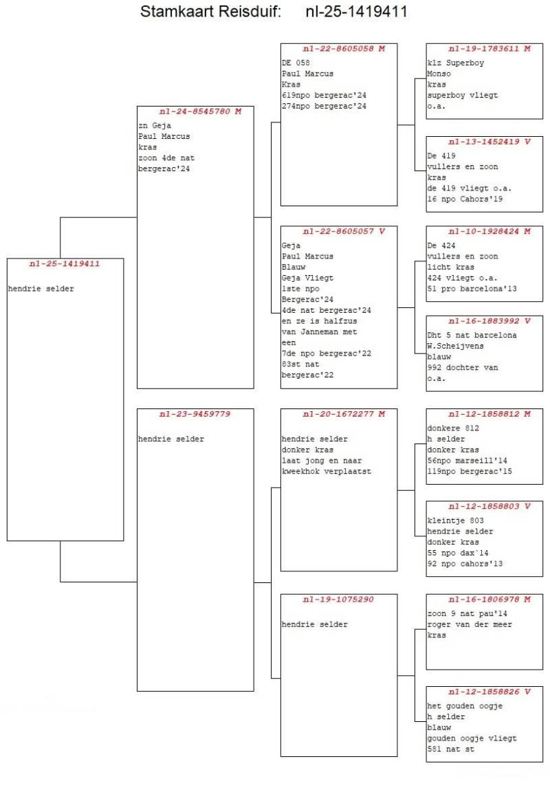 De start van marathonseizoen 2024 was voor Paul direct een schot in de roos. DE duivin GEJA was er vroeg bij en scoorde op deze Bergerac de 4e nat. Sect 1 en 1e afdeling Limburg. Haar halfbroer Janneman vloog eerder in 2022 al de 7e NPO en 83e Nationaal Bergerac. In de afstamming van Gea komen namen voor van John Vullers en zn, superboy van P.Stammen en zn en Speedy Bang van Wiel Schijvens. Het hokbestand bestaat in grote lijnen (kwekers alsook vliegers) uit duiven rechtstreeks van de goede duivenvrienden J. Vullers en Zn uit Roggel. Deze worden op het kweekhok ook ingekruist op enkele duiven verkregen via o.a. A. Vorselen, W. Scheijvens en H. Selder.